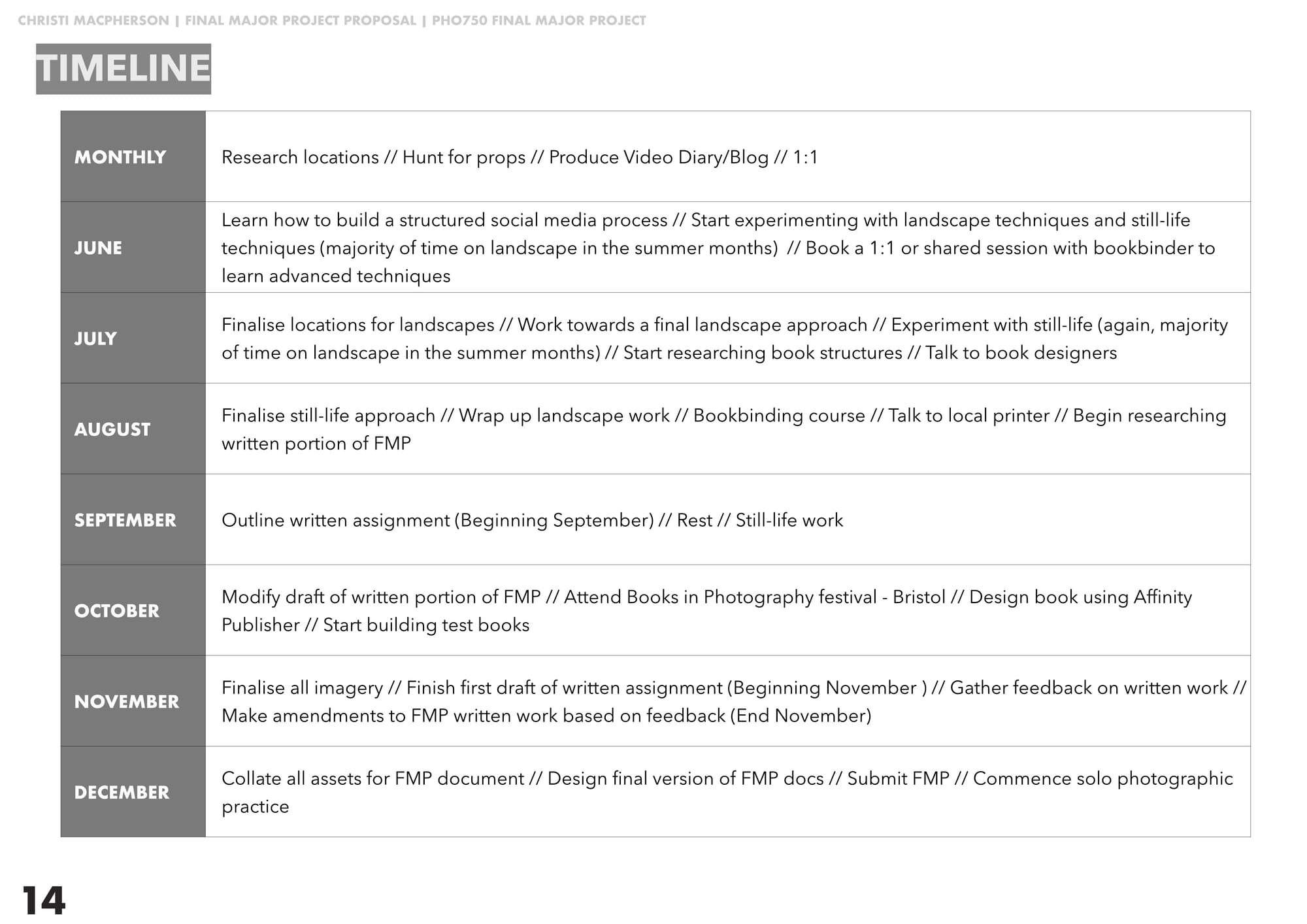 The way the modules have worked in the past is that there’s a front-loading of information. Research, both academic and visual, is all done early on but the real workload, the finalising of a project and the completion of academic writing assignments, like the Critical Review of Practice happens towards the end.